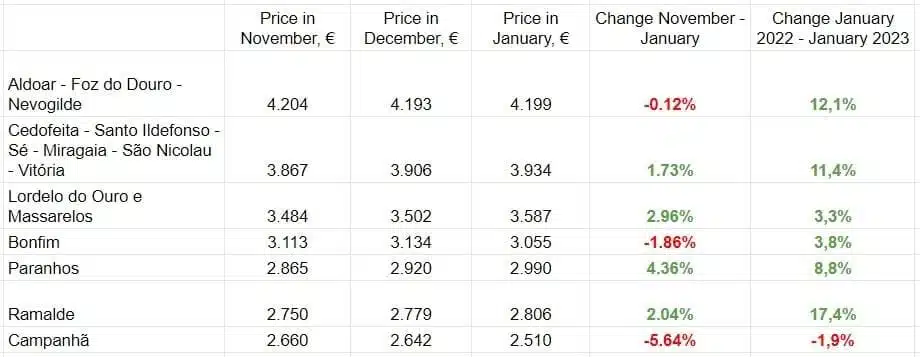 המחירים למ"ר בפרברים האחרים של פורטו בשלושת החודשים של 2023 עליהם התבססנו לא השתנו הרבה. עם זאת, במשך 12 חודשים, כולם הראו עלייה. אלופות בקצב הצמיחה השנתי של המחירים למ"ר ב-2022 היו טרופה (32.5%) ופנאפיאל (32.4%), שאף עקפה את מטוזינהוס.